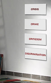 ![]() In der unter der Leitung von Prof. G.H. Klix (Australien) entstandenen Gemeinschafts- arbeit verbindet sich die heutige Präsenz der barocken Kloster- anlage Irsee mit deren Euthanasie- vergangenheit als ehemalige Heil- und Pflegeanstalt während der Nazi-Zeit. Mittels des aus Ton und Papierfasern bestehenden Materials Paperclay wurden Abdrücke der Klostermauern genommen, auf deren Rückseite die Schriftkopien von Briefen von Angehörigen der Euthanasie-Opfer aufgebracht wurden. |
