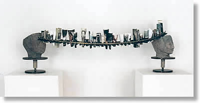 ![]() Ein zentrales Element der Installation bilden zwei nach oben geöffnete Köpfe, deren Blick nach innen gerichtet scheint. Sie verkörpern die Basis für die bildnerische Umsetzung des Prinzips der Selbstreflexion: Das Selbst vollzieht eine Doppelung seiner selbst und spreizt sich methodisch auf in betrachtendes Subjekt und betrachtetes Objekt. So öffnen sich Räume der Introspektion. Befindlichkeiten und Empfindungen finden sich und verdichten sich zu schaubaren Bildern, die sich als Lebensstationen entlang einer biografischen Leitschiene aufreihen. Durch die Transposition dieses allgemeinen Prinzips auf eine sehr konkrete persönliche Ebene führt die Installation den Betrachter in ein intimes Selbstportrait. |