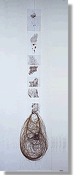 Vor dem Hintergrund einer sich stufenförmig verflüchtigenden Körperlichkeit bleibt die zu einem Schriftstück verdichtete Mutter-Tochter-Beziehung. Diese ist zentral eingebettet und damit anvertraut an eine schützende und doch zugleich behutsam Transparenz und Einblick wahrende Hülle eines schwebenden Drahtgeflechts, das in seiner Eiförmigkeit als Metapher für Fruchtbarkeit steht. Tod und Leben, Geborene und Gebärende verschmelzen so zu einer Matrix sich wechselseitig bedingender Wertepaare. |