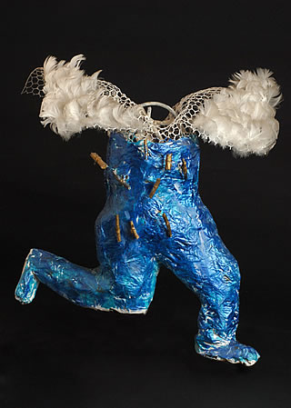 | quo vadis (2002) eisen, draht, holz, pappmaschee, acrylfarben, federn 70x70x80 cm |